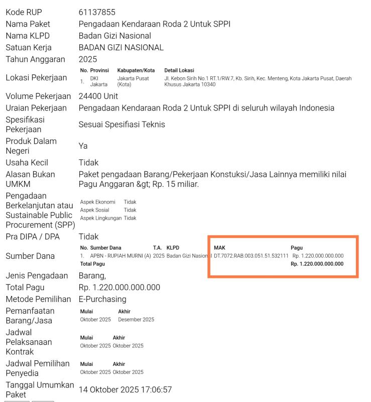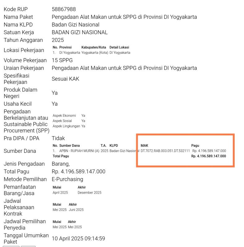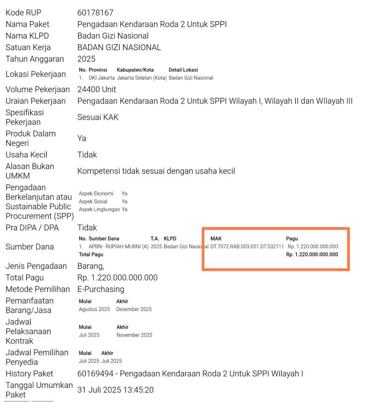Asal Anda tahu saja, paket Pengadaan Alat Makan untuk SPPG di Provinsi DI Yogyakarta (kode Rencana Umum Pengadaan/RUP 58867988) Rp4,1 triliun; Pengadaan Kendaraan Roda 2 untuk SPPI (kode RUP 60178167) Rp1,2 triliun; dan Pengadaan Kendaraan Roda 2 untuk SPPI (kode 61137855) Rp1,2 triliun menggunakan kode Mata Anggaran Kegiatan (MAK) yang sama persis: DT.7072.RAB.003.051.DT.532111 dan metode E-Purchasing (non-tender).